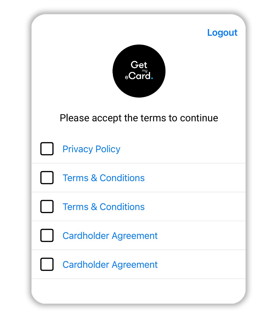 Accept the Privacy Policy, Terms and Cardholder Agreement to continue.
